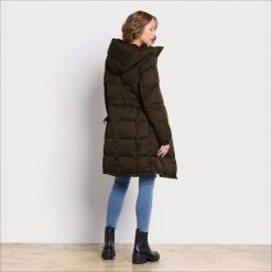 Keep it snug and simple with our pillow collar puffer coat with knit trim. Its 3/4 length flatters your shape while keeping you warm, and a water resistant finish can defeat any rainy day.