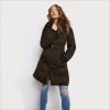 Keep it snug and simple with our pillow collar puffer coat with knit trim. Its 3/4 length flatters your shape while keeping you warm, and a water resistant finish can defeat any rainy day.